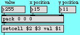 ・pack 0 0 0 オブジェクトとメッセージボックスの組み合わせは jit.matrix オブジェクトに適した setsell メッセージを形成する手助けとなります。最初に、値を書き込みたいx,yの位置をセットし、次ぎに書き込む値を指定します。x,y の位置が 0 0 の場合は、"value"と表示されたナンバーボックスを使って127という数値をpack 0 0 0 の左インレットに送ります。このようにするとメッセージ setcell 0 0 val 127 がメッセージボックスから jit.matrixへ送られます。