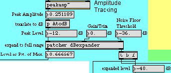 patcher dBexpander サブパッチによって、トラッキングを行う振幅値のdBレベルのコントロール、そして、シグナルを無視したい位置へのノイズフロア・スレッショルド(閾値)の設定を行うことができます。このサブパッチは、私たちが処理したいレベルを取得し、0dBから下限は -120dBまでのデシベルスケールのフルレンジに拡大します。下の例では、ノイズフロア・スレッショルドを -36dBに設定しています。この瞬間のMSPシグナルの振幅は0.251189で、これは -12dBにあたります。サブパッチはこのレベル(もともとは0から-36までの範囲での -12の値)を拡大し、レベルは0〜-120までの範囲での相当する値になります。結果としてレベルは -40dBになり、これがサブパッチの右アウトレットから送信されます。サブパッチに入力されたレベルとノイズフロアとの比は、Jitterにとって実用的なコントロールレンジである0〜1の範囲の値で表わされ、左アウトレットから出力されます。この例では、入力レベルは-12dBでノイズフロアより24dB大きい値であるため、指定された36dbの範囲の最大値の2/3にあたります。