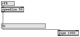 ・ パッチャーウィンドウ の左上隅にある( B と表示された)ナンバーボックスをドラッグして下さい。speedlim オブジェクトによって制限された後、それぞれの数値はメッセージボックスをトリガします。メッセージボックスは可変アーギュメント $1を持っているため、$1は メッセージを送信する前に、入力された数値で置き変えられます