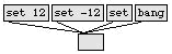 すでに、数値を後に続けたメッセージ set は、多くのオブジェクトに対して、出力をトリガせずに格納する値の指定や置き換えを行なうことができるということを見てきました。set に任意のメッセージを続けた場合、出力をトリガせずにメッセージボックスの内容を置き換えることができます。set だけの場合には、メッセージをクリアします(空の messageがトリガされた場合は何も送信されません)。