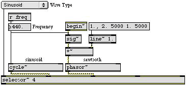 ・"Sawtooth" をポップアップメニューから選んで周波数を440Hzにセットし、オーディオをオンにして下さい。line~ オブジェクの上のメッセージボックスをクリックして下さい。line~ は10 秒間で1オクターブ上下するグリッサンドを作ります。再びそれをクリックし、グリッサンドを2秒間進行させて下さい。そして、ポップアップメニューを利用して、selector~ をオフにして下さい。5秒間待って、スイッチをノコギリ波に戻して下さい。グリッサンドは下降の途中にあるでしょう。この結果は、line~ オブジェクトが sig~、*~、phasor~ が止められている時でも動き続けていることを示しています。グリッサンドが終わったら、オーディオをオフにして下さい。