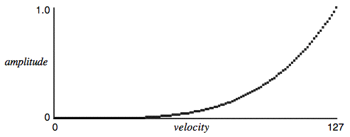 直線的なリニアマッピングを使用する場合、127から64(大部分のノートが演奏される範囲)のMIDIベロシティは、およそ6dBの振幅範囲しかカバーしません。指数関数へのマッピングは、これをおよそ24dBに増加させます。そのため、ベロシティの上の方の範囲は、振幅のより大きい変化を作り出します。